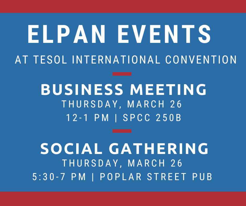 - Business Meeting, Thursday, March 26, 12:00-1:00 PM, SPCC 250B: Meet ELPAN Organization committee members Chris Stillwell, Kelly Metz-Matthews and Tabitha Kidwell to hear about progress on establishing ELPAN, share ideas, and learn how you can get involved.